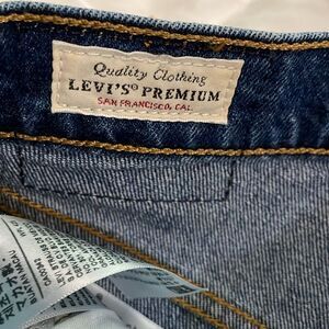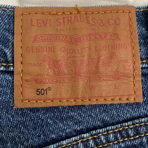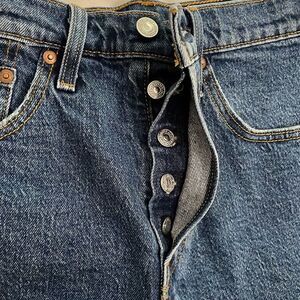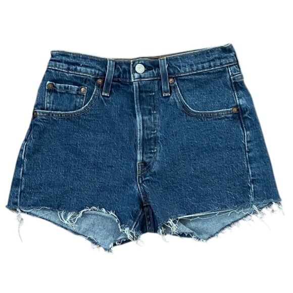 Levi's 501, medium wash, 99% cotton, 1% elastane, denim, cut-off, blue jean shorts in a women's size 25 Button fly front. 5-Pocket design. Machine washable. Approximate measurements shown in photos. In great pre-owned condition.