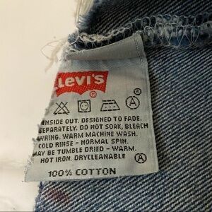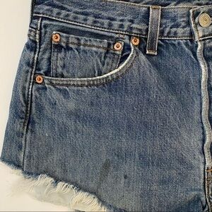 Levi’s 501 Denim Jean Cut Off Shorts. High waisted medium wash shorts with frayed hem. Back logo patch with red tab. Button fly closure with classic 5-pockets. Shorts have red paint markings but otherwise in very good preloved condition.