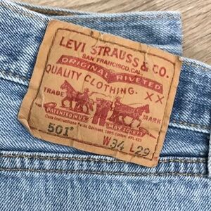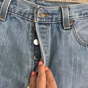 These were men’s Levis turned into cut offs. Waist size men’s 34. Raw frayed hem. Button fly.