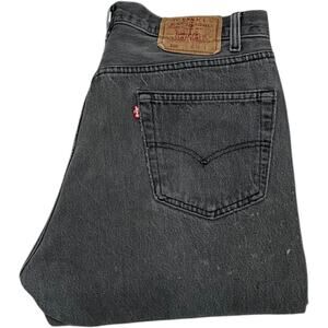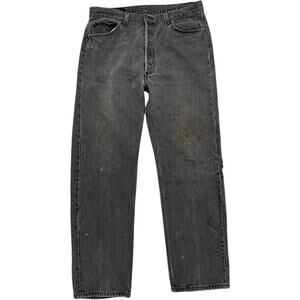 Tagged 36 but fits a 34 check measurements above. Made in USA 501s from March 1996 in a faded black wash. Worn by a welder on industrial boats. Naturally distressed with paint marks, surface wear, and blown-out details throughout — all for style. Crotch is in perfect condition with no damage. Button fly, original patch, and red tab still intact. Durable and broken-in with an authentic workwear edge.