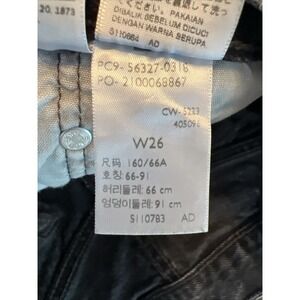 The product is a pair of Levi's 501 High Rise Button Fly Distressed Hem Shorts in Stowaway Black, size 26. Made from 100% cotton denim, these shorts are machine washable and feature a button closure, making them suitable for travel and casual occasions. The cut-off style and pockets add practicality to the versatile black color, making them a popular choice for summer, fall, and spring seasons. Perfect for women looking for a stylish and comfortable addition to their wardrobe.