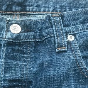 Levi's 501 Jeans. Blue denim, this denim fabric is a little bit different than the normal denim. It has a different texture. Slight wear at hem, nicely broken in.