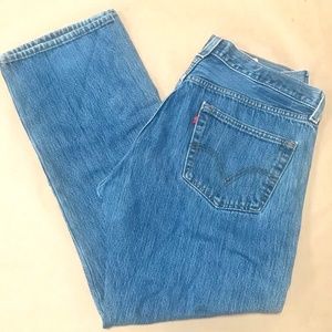 Levi's 501 Jeans. Made in Egypt. Vintage. Nice fade. Back patch missing. Slight fraying at hem as pictured.
