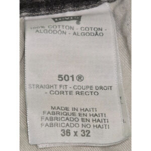 The product is a pair of Levi's 501 jeans for men in a size 36x32. These classic fit jeans feature a button fly closure, solid gray color, and distressed detailing for a casual and trendy look. Made of cotton denim, these pants have a mid rise and a straight leg style, perfect for a comfortable and on-trend wardrobe staple. The design includes a 5-pocket design and Levi's logo accents, making it a timeless and versatile piece for any season.