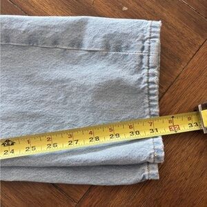 The product is a pair of Levi's 501 Men's Jeans in a size 30x32 with a straight fit, big “E”, and button fly. These premium classic jeans feature a light wash denim fabric, mid rise, 5-pocket design, a waist that is measuring closer to 32 inches and an inseam that measures 31-inches. The jeans have a solid blue color, are machine washable, and made of cotton. The Levi's 501 model is known for its timeless style, regular fit, and iconic button closure. Perfect for all seasons, these jeans are a versatile wardrobe staple for any man looking for a classic and high-quality denim option.