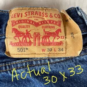 Levis 501 Jeans Mens 30x33 Straight Leg Dark Blue Denim Button Fly. Clean pre-owned EXCELLENT condition with no significant wear. Measures slightly different than tag, so be sure to check photos for actual measurements and all other details.