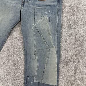 Condition: Brand New with Tags. These jeans are marked "Irregular" on the inside waistband. Fabric shows intentional distressing, visible factory repairs, patchwork, reinforced stitching, and fraying at the cuffs as shown in photos. Please see pictures for all unique details on legs, inseams, and hems.