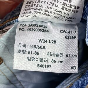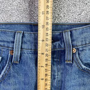 The product is a pair of Levis 501 Jeans in women's size 24 with a skinny mid-rise fit, featuring a medium wash and button fly closure. Made of denim fabric with a blend of spandex and cotton, these jeans are designed for comfort and have a 5-pocket design with a distressed look. The classic blue color and solid pattern make them versatile for any season, while the Levi's brand and logo accents add a stylish touch to the garment. Perfect for the modern woman looking for a timeless wardrobe staple with a hint of 90s flair.
