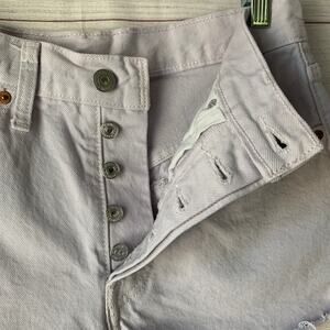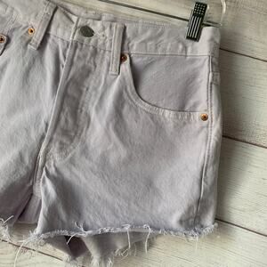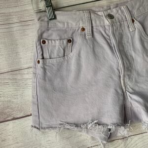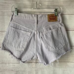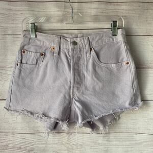 Light lavender purple denim jean shorts by Levi's 501. These vintage-inspired shorts have the standard 5-pocket design, a 5-button front closure with 4 of the buttons hidden, and a frayed and slightly rolled bottom hem. They are pre-owned and in great condition.