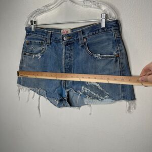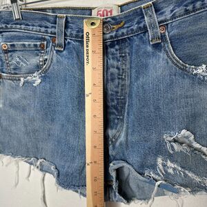 Levis 501 Medium Blue Wash Button Fly Distressed Raw Hem Shorts 34