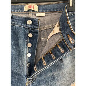 Classic Levi's 501 Original Button-Fly Jeans in a medium wash, featuring a straight-leg cut. Distressed for a stylish worn-in look. Made of 100% cotton. W34 x L30.