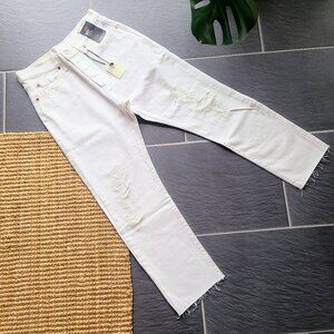 Levi's 501 Original Cropped High Rise White Distressed Denim Raw Hem Straight Leg Jeans