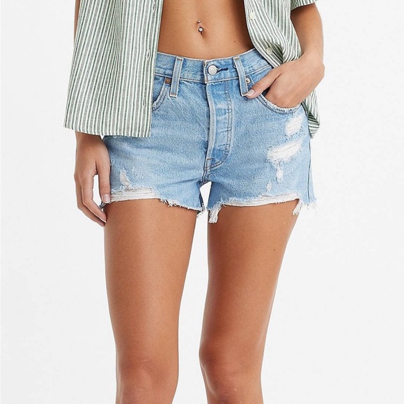 Stylish Levi's jean shorts with a distressed look. Light blue color adds a fresh touch, color is called “Oxnard”. Worn once, in perfect condition
