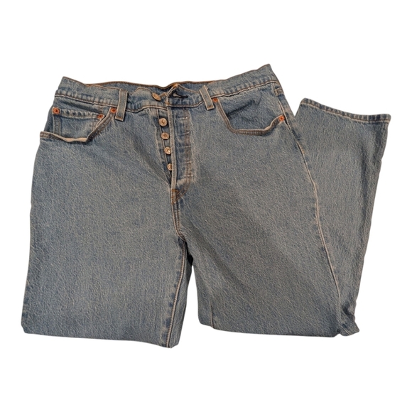 Stylish Levi's 501 Original ankle jeans. Light blue denim. Button fly closure.