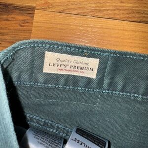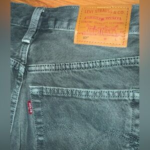 Classic pair of Levi’s 501 Premium jeans in a unique green-gray wash. Features the iconic button fly, straight leg, and rigid denim construction. This pair is part of Levi’s Water<Less® collection, designed to reduce water usage in production.
