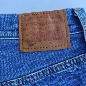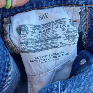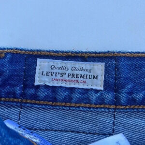 Levi's 501 Premium distressed denim cutoff jean shorts. These iconic shorts offer a classic high-rise fit with a button fly and frayed hem for a touch of edgy style. Designed for a flattering silhouette, they feature the signature Levi's five-pocket styling and a vintage-inspired wash that adds character. Perfect for a casual day out, a music festival, or a relaxed summer evening.