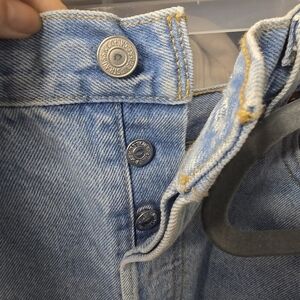 Levis 501 Rigid Blue Jean Shorts Buttonfly Raw Hem Casual Wardrobe staple basic. High waisted, whiskering, 5 pocket.