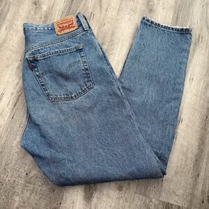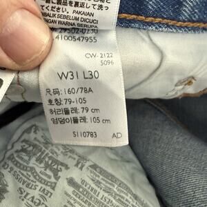 The product is a pair of Levi's 501 S Skinny Jeans for women in size 31x30. These blue denim jeans feature a distressed button-fly closure, high rise, and a 5-pocket design. The jeans are made of 100% cotton, making them comfortable and breathable for all seasons. With the iconic Levi's logo accents and a regular fit, these jeans are a classic and stylish addition to any wardrobe, perfect for a hipster or retro look.