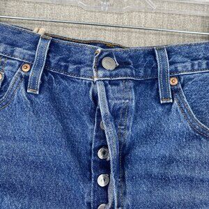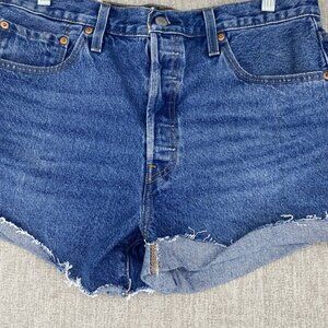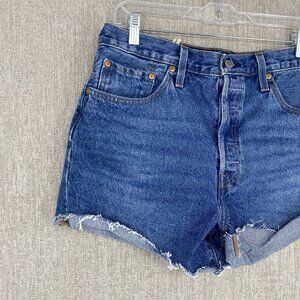 Levis 501 Shorts Women 32 Blue Cut Off High Rise Button Fly Distressed Hem Denim Condition: pre-owned | no stains or holes noted Please see condition notes BEFORE purchasing for any notes I may have made about the condition, wear, or size discrepancies. Shrinking is common in cotton materials so please see photos for measurements. As always, feel free to message any questions you may have. Thanks! - Nina