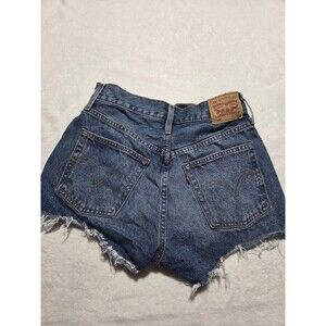 The product is a pair of Levi's 501 Shorts for women in a size 26 waist. These blue denim shorts feature a distressed look, button fly closure, and are made of cotton. The high-rise design, 5-pocket design, and 2-inch inseam make them suitable for casual and travel occasions. With a regular fit and solid pattern, these shorts are perfect for any season and can be easily cared for with machine washing. The vintage 90s theme adds a stylish touch to this timeless wardrobe staple from Levi's.