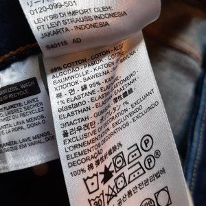 Levi's 501 Skinny Dark Blue Distressed Hem High Rise Jeans SZ 27. Very good preowned condition. High rise. Button Fly. 99% cotton, 1% elastane. Measurements in photos approx.