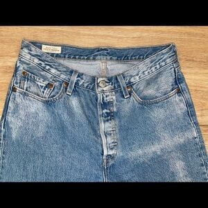 These Levi’s are in amazing condition. They are blue with lighter patches throughout with frayed bottoms.