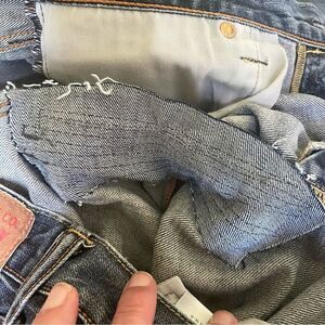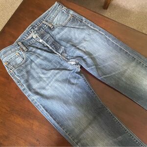 These jeans are in good used condition. Only flaws are some distress to the hem on the left leg and a professionally repaired hole in the crotch area. Otherwise in good condition. Let me know if you have any questions!