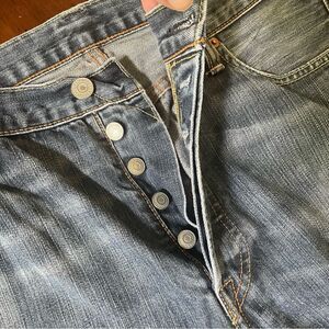 Levi’s 501 Washed and Distressed Blue Jeans Button Fly Size 34/34