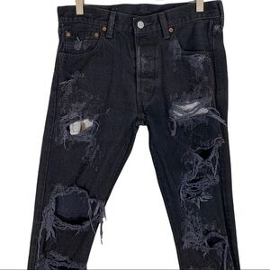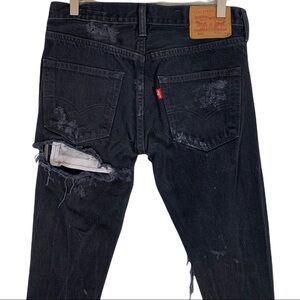 RARE Levi's 501 White Oak Sledged Denim Extreme Destroyed Raw Hem Slim Leg Jeans w/ Butt Slit Size 30. Features: Factory color fading and whiskering. Factory extreme destroyed with butt slit. Raw hem. Slim leg fit. Hidden Button Closure.