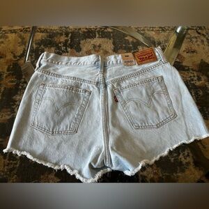 Chic Levi's denim shorts. Frayed hem adds style. Ideal for everyday wear.