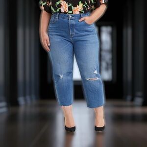 Levis Women's Plus Size High Rise Straight Crop JeanThe blue jean that started it all, cropped for a contemporary aesthetic. Let your style evolve with the Levi's 501 Crop jeans. Jeans sit higher at thewaist and has a classic straight leg at a cropped length for a timeless look. These classic cool jeans are sure to elevate your style and keep you fashionable at all times. Dress them up with a heel or pair with your favorite sneakers for a more casual, everyday look. Classic five-pocket design with signature arcuate stitch at back pockets. Beltloop waistband with brand patch at back waist. Classic zipper fly and button. Destructed finish.