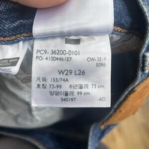 Up for sale is a pair of Levi’s 501 women's distressed denim jeans. These jeans have a button-down fly and a straight style. They are made of cotton and have a fabric type of denim. The jeans are pre-owned and have a distressed feature. The inseam is 26 inches and the size is 29W. The color is blue and the brand is Levi's.
