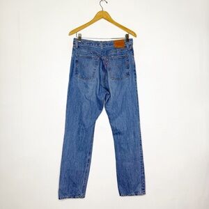 Classic Levi’s 501 jeans in a medium wash with light distressing and a timeless button fly. Five-pocket design in durable denim.