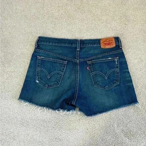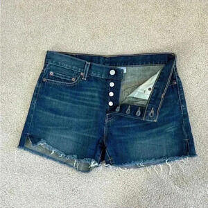 Levi’s 501 blue high rise denim jeans in size 29. These are in good used condition but do have signs of wear such as minor distressing.