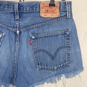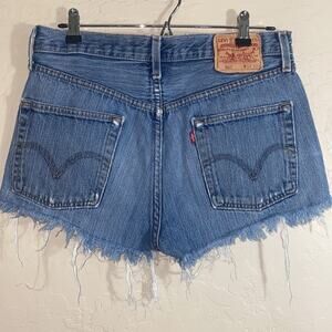 Levi’s 501 cut offs. exposed button fly. Distressing and frayed hem. tag says 32. Fits more like a 28.