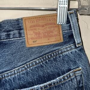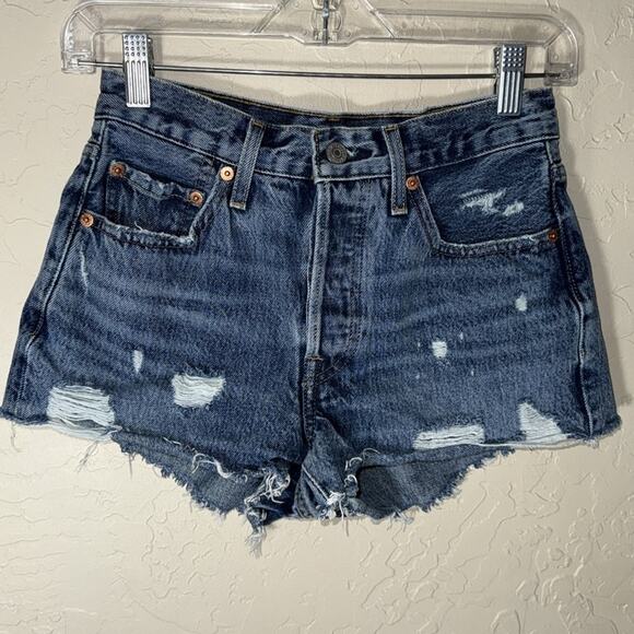 Levi’s 501 jean shorts distressed cut offs. Button fly. Frayed hem. High rise. Not much stretch. Size 24. Approximate measurements.