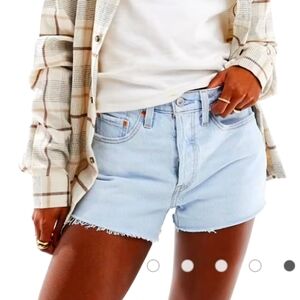 Elevate your casual style with these classic light blue denim shorts. Perfect for any occasion, these shorts offer comfort and a timeless look.Levi's 501 original denim shorts in light blue, button fly, high rise, size 28, for women, no stretch, 100% cotton, 2.5 inch inseam, 28 inch waist, 14 inch length, 5 pockets, has fraying on legs, this garment is well washed, has faint yellow stains, you would have to look very closely to notice the stain, thick denim, good condition.