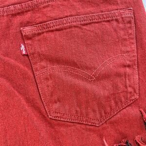 Levi's 501XX Women's Denim Shorts. Tagged size W33 and are in good preowned condition. These red shorts are custom cutoff shorts with a button fly and a frayed hem. These denim shorts are mid rise and are a great choice to spice up any summer outfit.