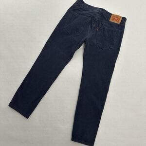 These Levi's 502 corduroy pants are a classic 90's style in a blue navy color. The pants have a tapered fit, with a waist size of 30 inches and an inseam of 28.5 inches. The corduroy fabric gives them a textured look, perfect for a hipster, school, hippie, or bohemian style. This versatile piece is easy to care for and ideal for a preppy or city aesthetic. The Levi's logo adds a touch of authenticity to these timeless pants.