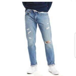 Distressed stretch fabric blend 5-pocket Zipper fly with button closure. Sits at waist Regular fit through seat and thigh Slightly tapered leg, is a more refined, modern option to straight jeans.