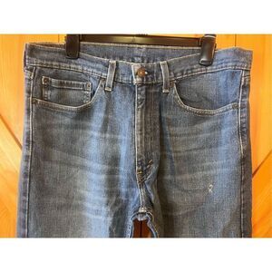 Levi’s 505 Blue Denim Regular Men's Red Tab Straight Jeans Size 34 X 32 has a hole in front some wear on bottoms see pictures  measurements 34x32” 11” rise (1416)
