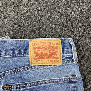 The product is a pair of Levi's 505 Men's Blue Straight Leg Regular Fit Jeans in size 36x30. Made of cotton denim with a medium wash, these jeans feature a classic 5-pocket design, mid-rise waist, and a solid blue color. The straight leg style and regular fit make them a versatile option for all seasons. With the iconic Levi's logo as accents, these jeans are a timeless and stylish addition to any man's wardrobe.