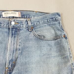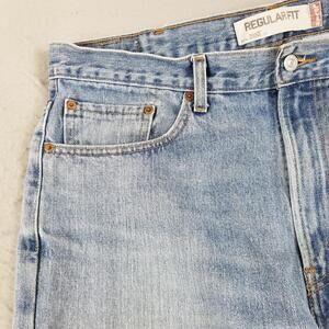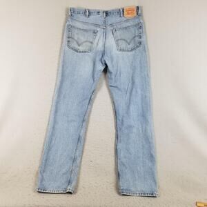 Details: Classic Levi's 505 Regular Fit jeans. Five-pocket styling with rivet details. Button and zipper fly closure. Made from 100% cotton denim. Traditional medium blue wash with faded look. Tag: 505, Regular Fit, W38 L36. Made in India.