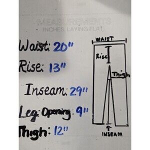 Measurements (from photo): Waist 20", Rise 13", Inseam 29", Leg Opening 9", Thigh 12"
