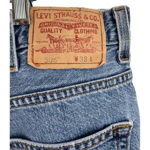 Levi's 505 men's shorts in size 38 feature a regular fit, straight cut, and high-rise design. Made with 100% cotton, these blue denim shorts have a zip fly and a small flaw.
