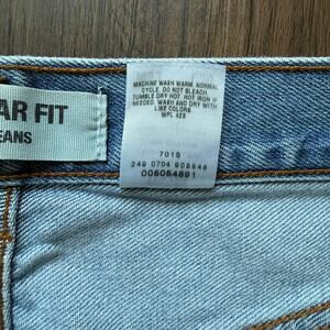 Men’s size 33x30. Approx. Flat waist measures 16.5 inches, rise is 10.5 inches, inseam is 29 inches, and leg opening is 8.5 inches flat. Fabric is 100% cotton with no stretch. Condition is good pre-owned with some character: a small stain on the thigh, let-down hem, and a small hole near the hem (see photos).