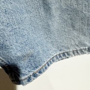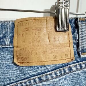 Vintage Levi’s baggy shorts 550 size 36 relax fit actual measurement 16 1/2 inches waist flat 9 inch inseam. There’s some staining on the front.