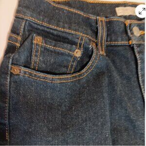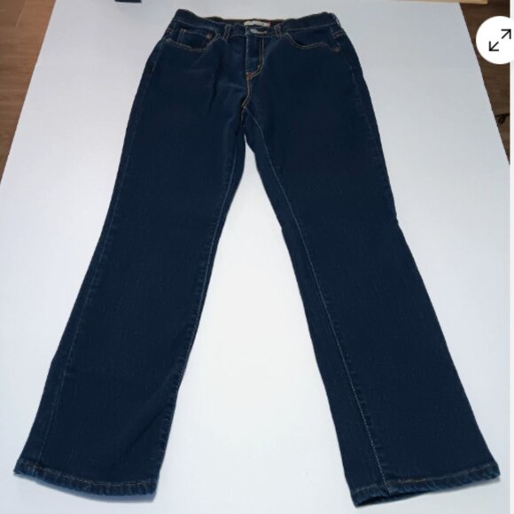 These Levi Strauss & Co. 505 Straight Leg Jeans in Women's Size 8 Short feature a dark wash and a classic fit with just a touch of stretch. Pre-owned in excellent condition, they offer both comfort and timeless Levi's style.
