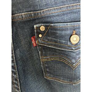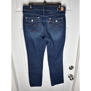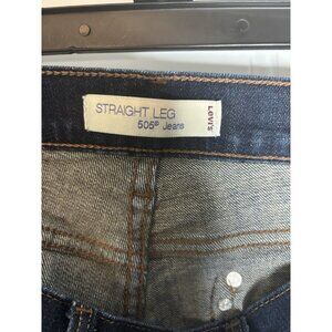 The product is a pair of Levi's 505 Straight Leg Jeans in women's size 8M with a medium wash denim finish. These classic casual jeans feature a solid blue color, a mid-rise fit, and are made of a cotton blend fabric. They close with a zip and button and have a regular fit, making them comfortable for everyday wear. With the iconic Levi's logo and button accents, these jeans are a timeless wardrobe staple for women in search of a versatile and stylish denim option.