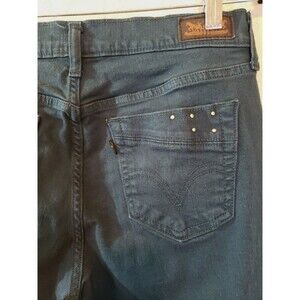 Levi's 505 Straight Leg Women's Jeans in dark teal green denim with studded accents. These regular fit jeans have a mid-rise waist and come in size 8. The straight leg style features comfort and pockets, making them a practical and stylish choice. The brand is Levi's and the model is Levi's 505.